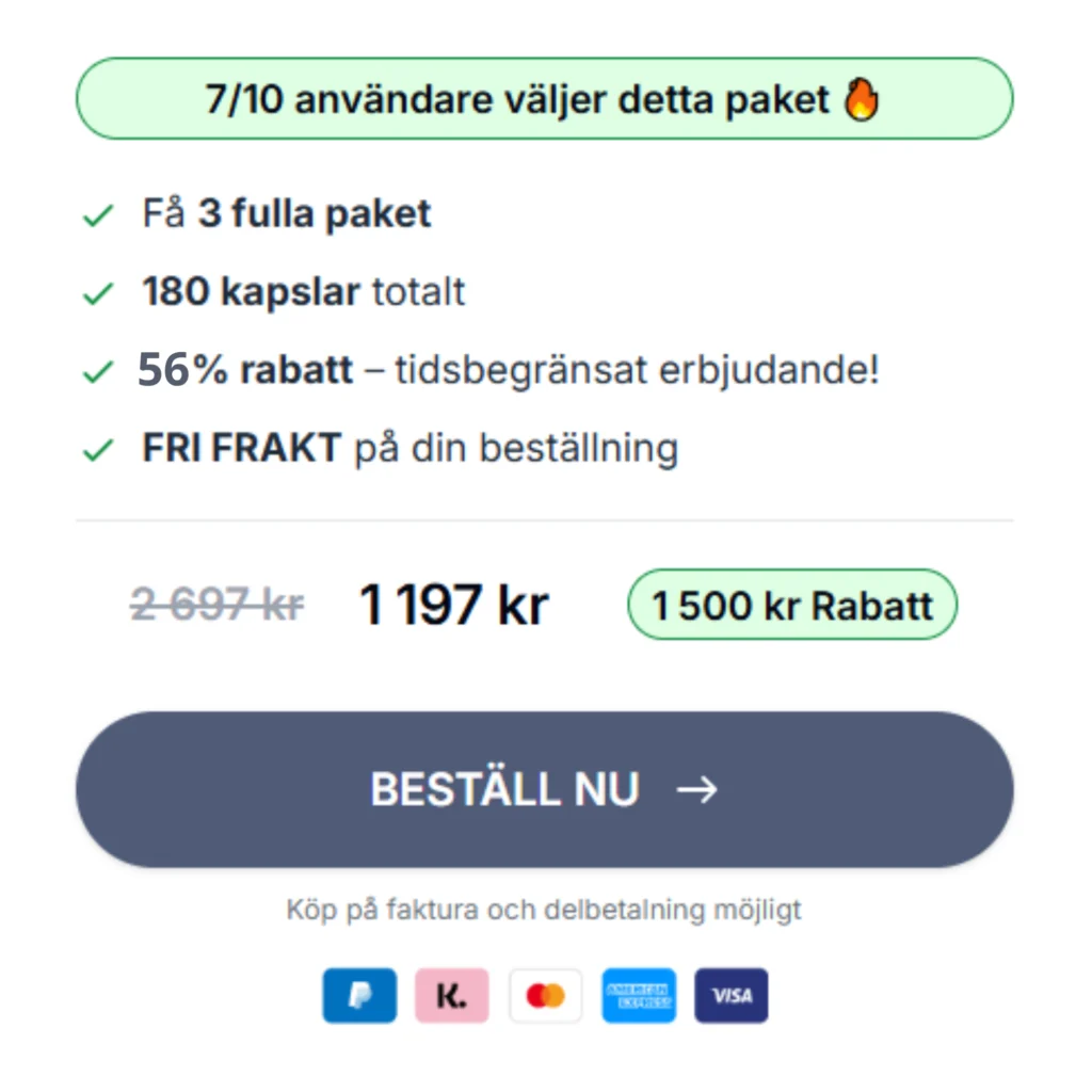 Rekommenderad dosering: Ta en kapsel en gång om dagen, okokt, med två stora glas vatten, cirka 15 till 30 minuter före en måltid (lunch eller middag). Du hittar mer information här.
